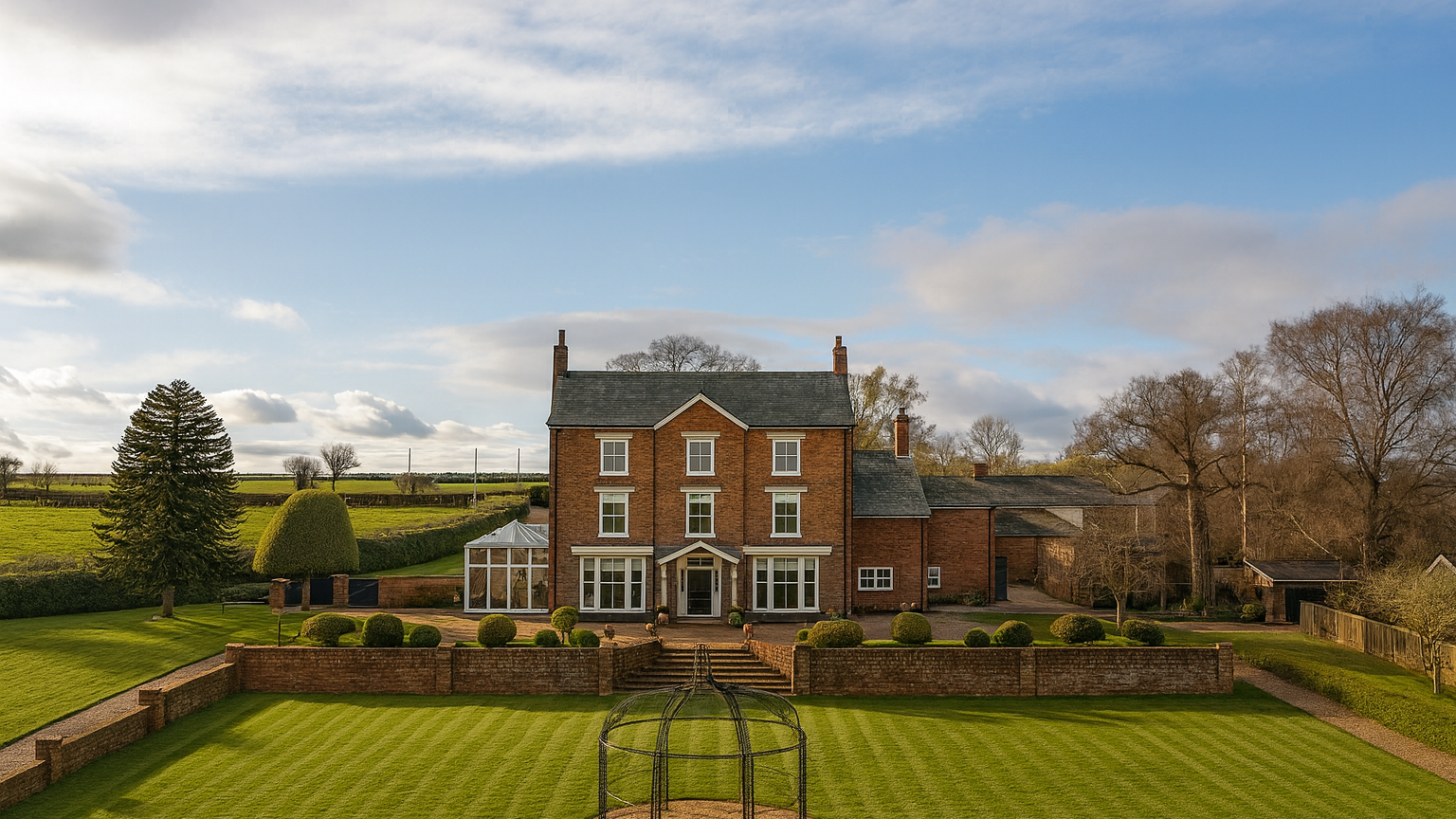 We began with aerial work to establish the grandeur of the approach. The drone’s slow, measured ascents revealed not just the house’s commanding façade but also its secluded setting on the edge of the village. Early morning light filtered through mature trees, creating shifting patterns that we carried through into our ground-level compositions.
